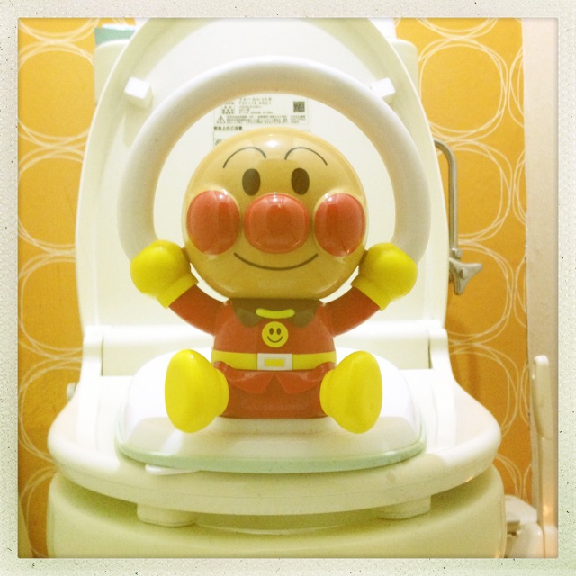 And then we bought an overpriced Anpanman potty from our local Toys R Us. We let Boy pick it out — naturally he gravitated to Japan’s cutest toddler-sized superhero. The potty was AWESOME, a convertible number that could be used on the big toilet, or as a stand-alone. There was a bright pee-colored cloth seat cover — perfect for the cold winter months. And three buttons on the jolly bean-filled-breadbun-inspired face played the cartoon theme song and adorable catch phrases — great for entertaining the child while he waited for that “gotta-go” feeling to overtake him.
